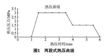 研究選取兩段式的熱壓曲線(如圖1),在較高壓力,熱壓時間,熱壓溫度等熱壓參數(shù)不變的條件下,添加不同含量的改性劑壓制門板,測出吸塑門板的靜曲強(qiáng)度、內(nèi)結(jié)合強(qiáng)度等力學(xué)性能指標(biāo),研究角蛋白改性劑對吸塑門板質(zhì)量的影響并分析掌握角蛋白改性劑添加量對吸塑門板質(zhì)量影響的規(guī)律,進(jìn)而得出控制板材較佳性能的工藝參數(shù)。