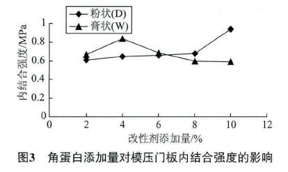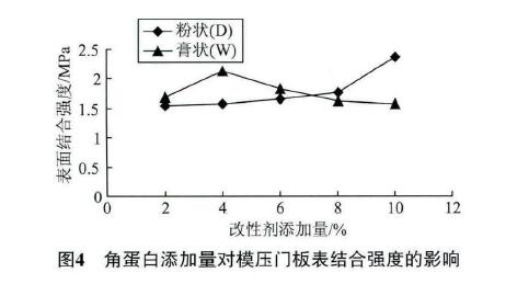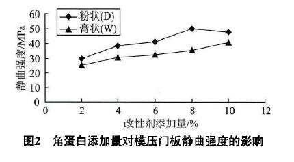 1)為了研究角蛋白改性劑對板材性能的影響,分別添加粉(D)、膏(W)狀角蛋白改性劑,添加量均為2%、4%、6%、8%和10%壓制模壓板進(jìn)行單因素試驗,測定其靜曲強(qiáng)度、內(nèi)結(jié)合強(qiáng)度、表面結(jié)合強(qiáng)度、吸水厚度膨脹率和甲醛釋放量等,確定制作吸塑門板的較優(yōu)方案。