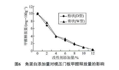 4)粉狀(D)角蛋白改性劑降醛效果好于膏狀(W)角蛋白改性劑。隨著角蛋白添加量的增加,模壓纖維板的甲醛釋放量明顯下降,角蛋白改性劑添加量為6%時,甲醛釋放量分別減少到2.8和3.2mg/100g,模壓纖維板等級為Eo級;當(dāng)添加量增加到10%時,甲醛釋放量僅0.89和1mg/100g,模壓纖維板等級為很Eo級。