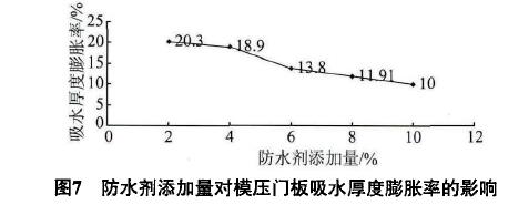 為了提高模壓纖維板的耐水性能,加入自主研制的防水劑(不飽和二元酸與多元醇按質(zhì)量比3:1混合)研究對其耐水性能的影響,以確定在保證吸塑門板吸水厚度膨脹率合格條件下的較優(yōu)方案,試驗結(jié)果見圖7。
