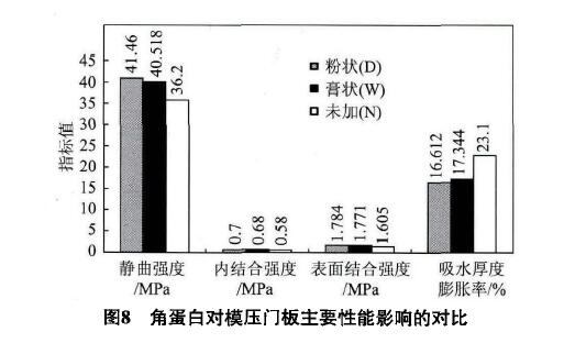 由靜曲強(qiáng)度的對比值可知,添加角蛋白改性劑后板材的靜曲強(qiáng)度高于未添加改性劑的板材。其中,添加了D型角蛋白改性劑的靜曲強(qiáng)度略高于W型,綜合來看,較優(yōu)方案為D粉狀。